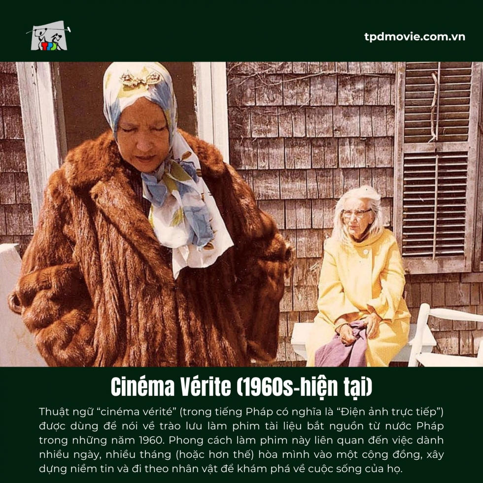 Thuật ngữ “cinéma vérité” (trong tiếng Pháp có nghĩa là “Điện ảnh chân thực”) được dùng để nói về trào lưu làm phim tài liệu bắt nguồn từ nước Pháp trong những năm 1960. Phong cách làm phim này liên quan đến việc dành nhiều ngày, nhiều tháng (hoặc hơn thế) hòa mình vào một cộng đồng, xây dựng niềm tin và đi theo nhân vật để khám phá về cuộc sống của họ. Những tác phẩm Cinéma Vérité đáng chú ý có thể kể đến như Grey Gardens (1975, Albert và David Maysles), Paris Is Burning (1990, Jennie Livingston), hay Hoop Dreams (1994, Steve James).