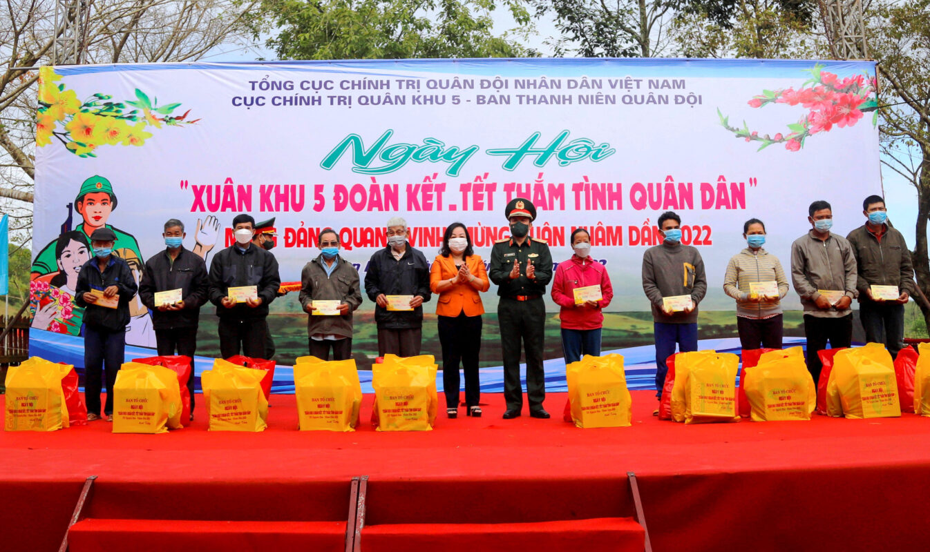 Đại tá Lê Xuân Đông, Chủ nhiệm Chính trị Bộ Tham mưu Quân khu 5 trao những phần quà Tết ý nghĩa tặng các gia đình chính sách, hộ nghèo.